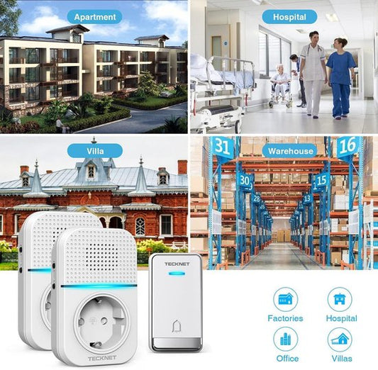 Tecknet deurbel - Deurbelset - Twee ontvangers - Draadloos - Duurzame zender zonder batterijen - Wit