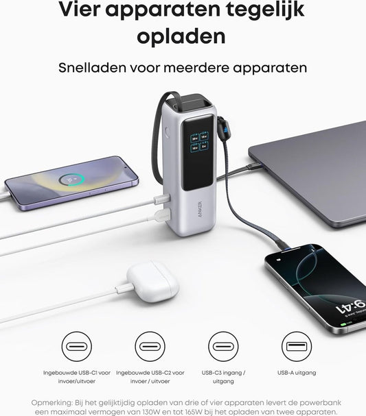 Anker PowerCore 25K Powerbank 25.000mAh - 165W - 3x 100W USB-C Poorten - Zilver + Anker Nano reisadapter, USB-stekker 5-poorts stroomadapter met 1 AC, 2 USB-A en 2 USB-C poorten - Zilver