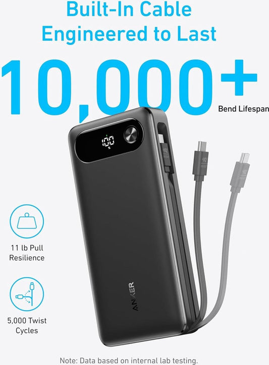 Anker Powerbank, 87 W Max snellaadaccu 20.000 mAh draagbare oplader met geïntegreerde USB-C-kabel, 2 USB-C en 1 USB-A, voor MacBook, iPhone 15/14-serie, Samsung, Switch en meer