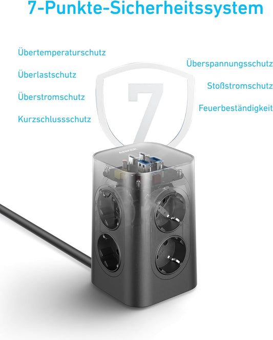 Anker Meervoudig stopcontact met schakelaar, 8-voudige stekkerdoos, stekkerdoos met 4 USB, 20 W USB C-snel opladen, meervoudige stopcontact, overspanningsbeveiliging, 2 m kabel, stekkertoren voor