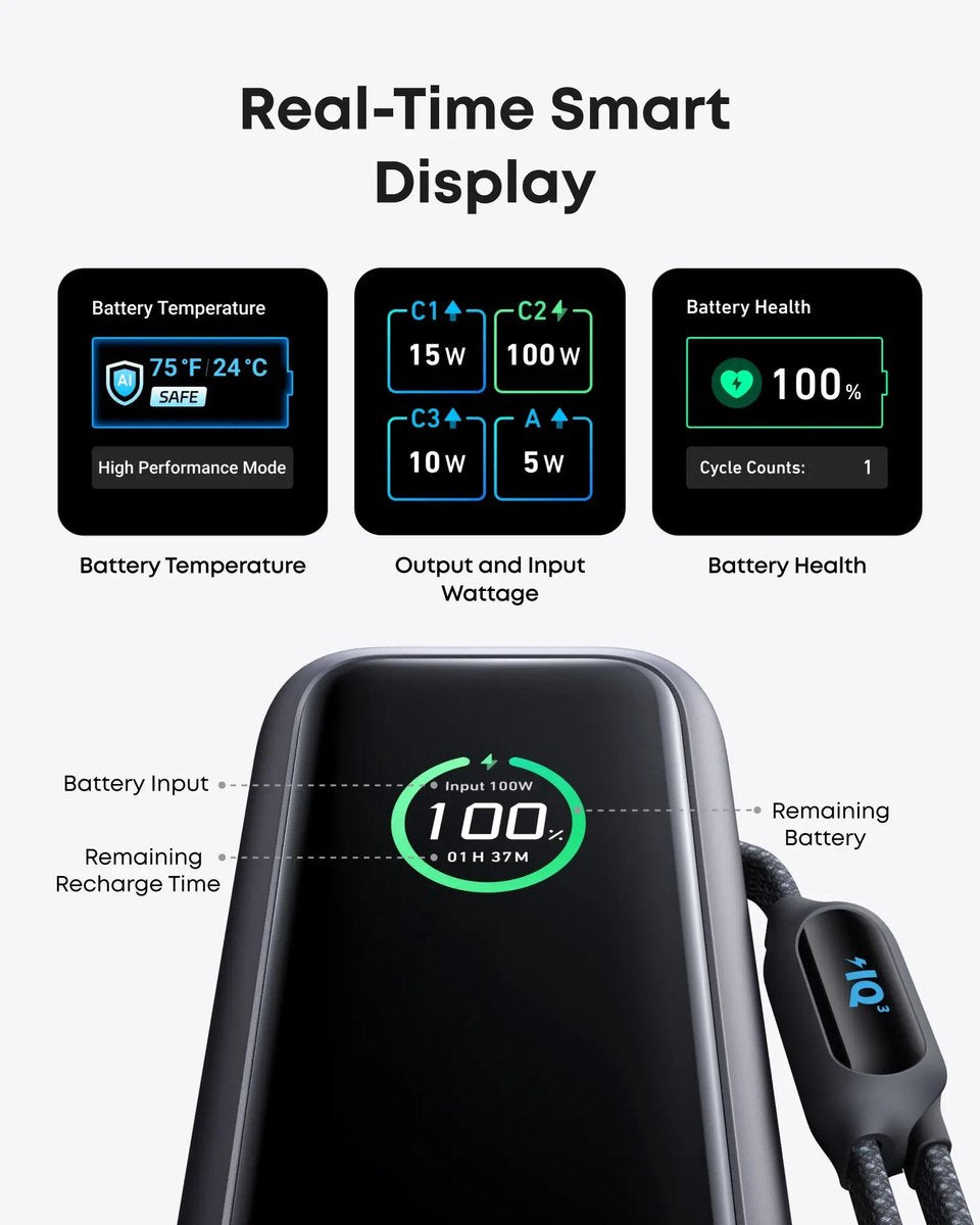 Anker PowerCore 25K Powerbank 25.000mAh - 165W - 3x 100W USB-C Poorten - Zwart - Ingebouwde Intrekbare Kabels - Real-Time Smart Display - Vliegtuigvriendelijk Ontwerp