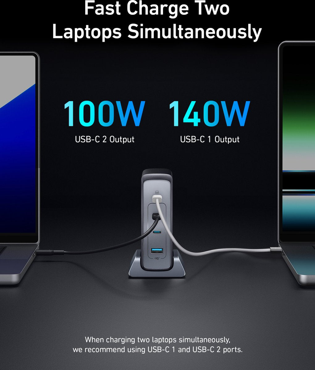 - Snel twee laptops opladen: Laad twee laptops tegelijk op, met USB-C-poort 1 die 140 W levert en USB-C-poort 2 die 100 W levert.
