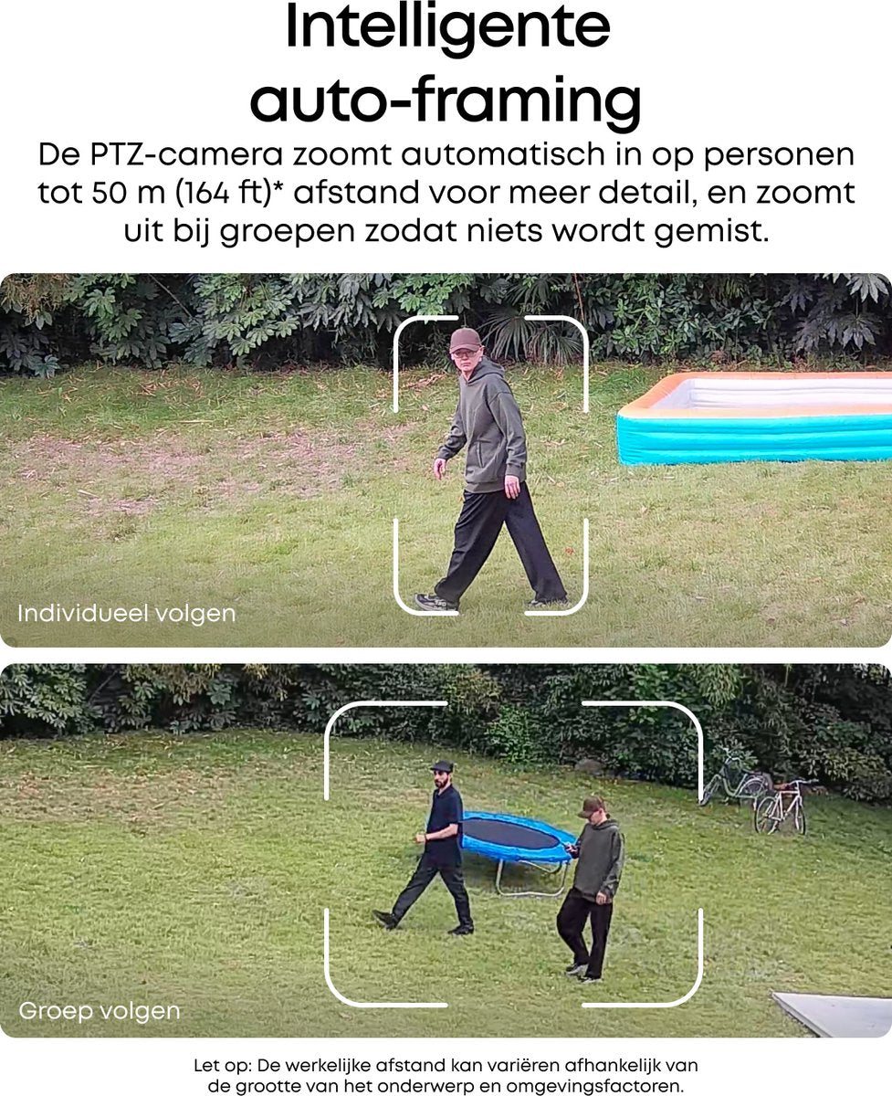 - Bullet-naar-PTZ-tracking en auto-framing: Zodra de bulletcamera een persoon detecteert, schakelt de PTZ-camera direct over. Deze vergrendelt het doelwit, volgt het en zoomt in tot op 50 meter afstand. Komen er meer personen in beeld, dan zoomt de camera automatisch uit zodat iedereen zichtbaar blijft.